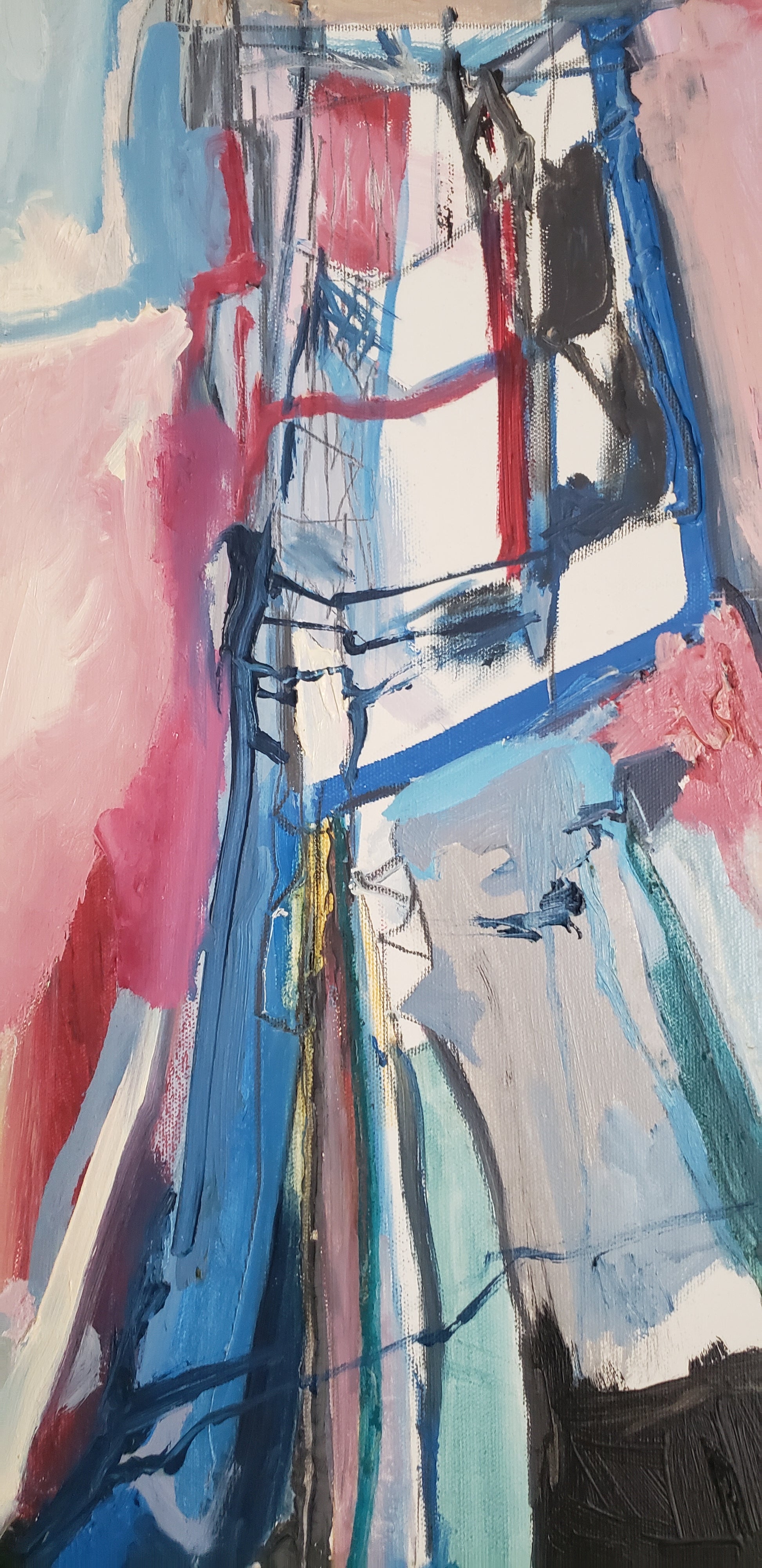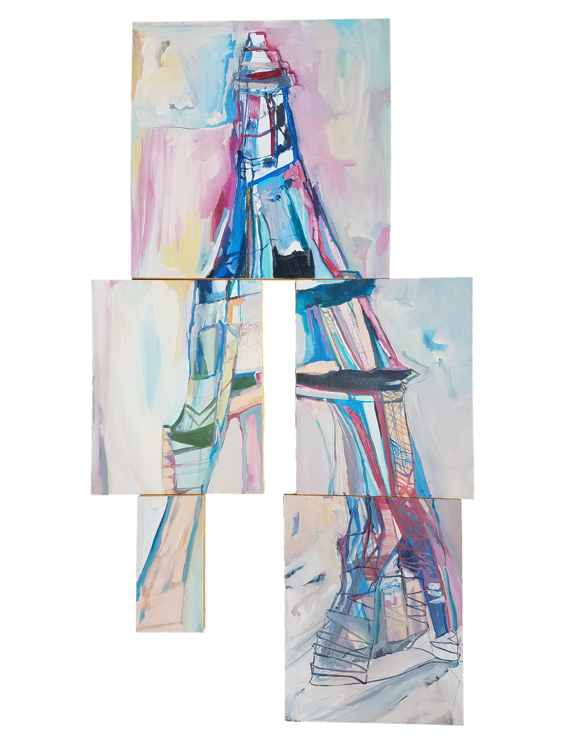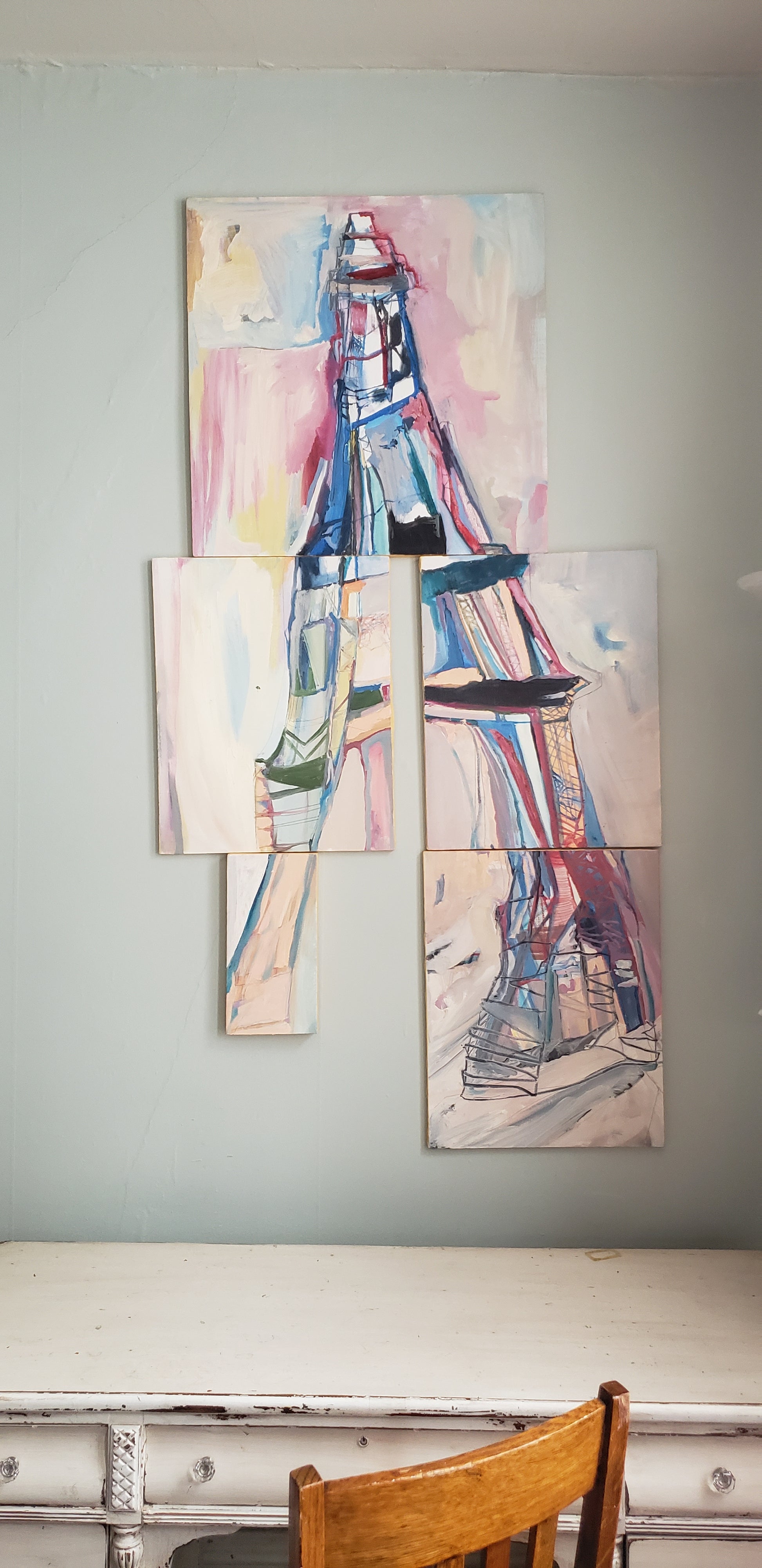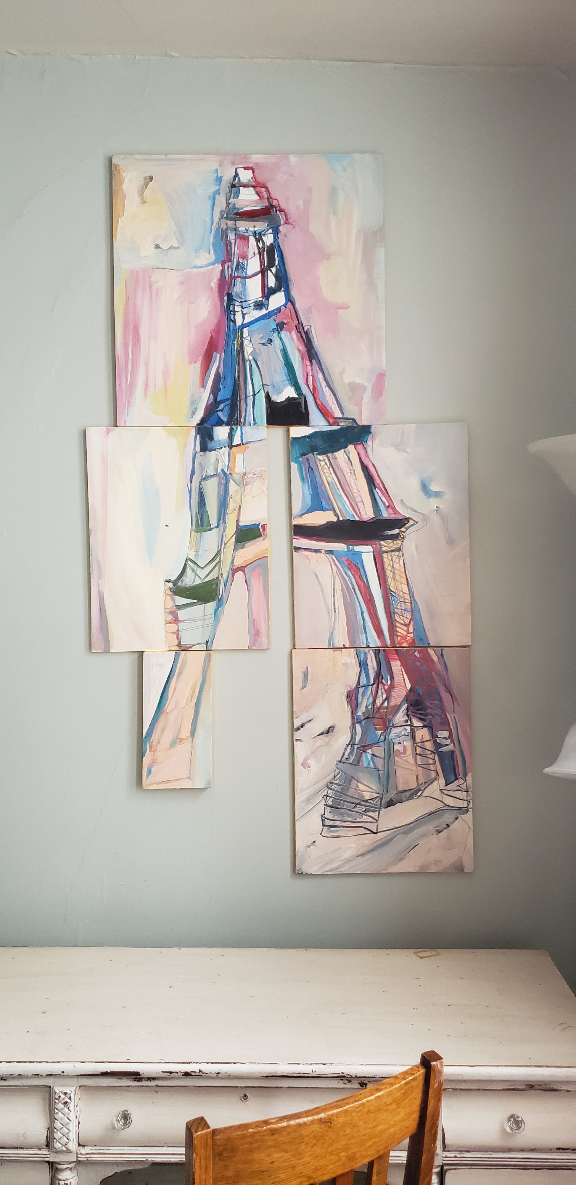 Tour Eiffel is my original abstract expressionist painting, created in 2011 after seeing Willem de Kooning’s retrospective at MoMA—a moment that deeply moved me. With limited resources, I laid gifted pre-stretched canvases on my kitchen floor and painted from the heart. The Eiffel Tower emerged playfully across the panels, its quirky silhouette and bold brushstrokes echoing “Bill’s” spirit. This large oil painting (48 x 44”) is both a tribute to my artistic “father” and a love letter to Paris.