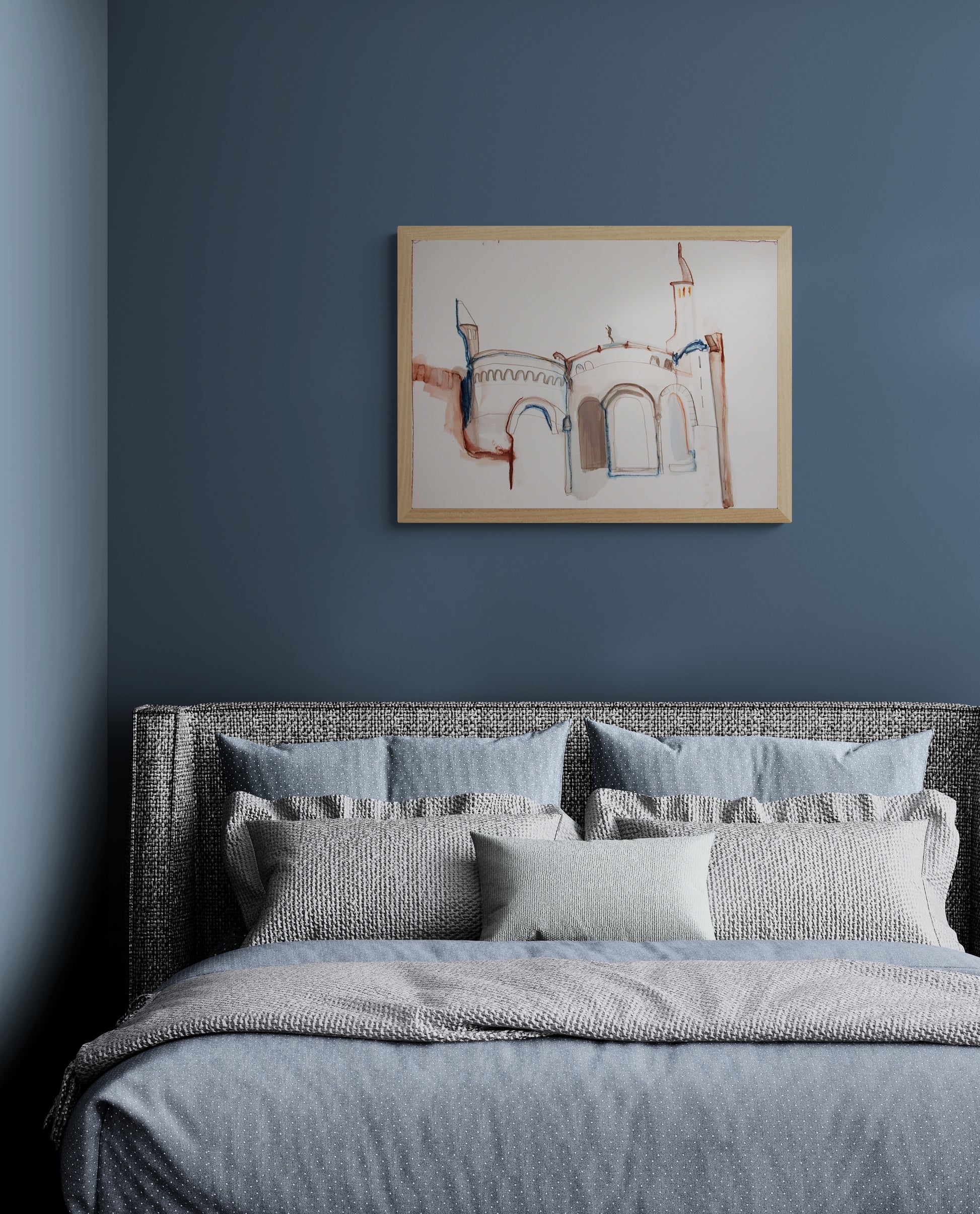 White Heart is a minimalist drawing of the Sacré-Coeur Basilica in Paris that carries both personal memory and architectural grace. I created this with thoughts on the contour of the building, the skeleton of glistening, self-cleaning marble that lights up the hilltop of Montmartre, even in daylight. While living in Paris, I spent countless hours exploring the lines and textures of the city’s architecture, often beginning my sketches with a blind contour—a technique I still love for its intuitive, fluid energy. In this piece, made after returning home, I focused on the elegant flow of arches and domes, especially the delicious intersection where the left spire meets the tower. This Paris artwork is a quiet tribute to one of my favorite landmarks.